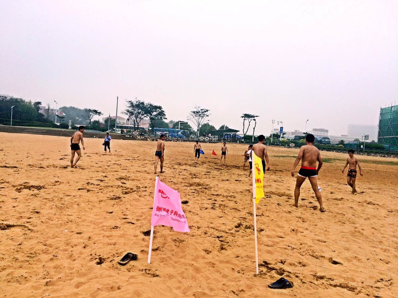 經(jīng)過六七個小時的長途大巴,到達此次行程的第一個景點,青島黃島金沙灘,金沙灘位于山東半島南端黃海之濱青島市黃島區(qū)金沙灘路。南瀕黃海,呈月牙形東西伸展,全長3500多米,寬300米。金沙灘水清灘平,沙細如粉,色澤如金,海水湛藍,水天一色,故稱“金沙灘”。青島金沙灘是我國沙質(zhì)最細、面積最大、風景最美的沙灘,號稱“亞洲第一灘”。我們懷著激動的心情,踏上金沙灘,海風習習,潮來汐往,我們盡情的享受自然的饋贈,踏浪、戲水、撿貝殼、筑沙雕,感嘆大自然的鬼斧神工。金沙灘景致怡人,幾個小時的時間很快過去,大家玩的不亦樂乎,男同事們還在沙灘上踢起了足球。