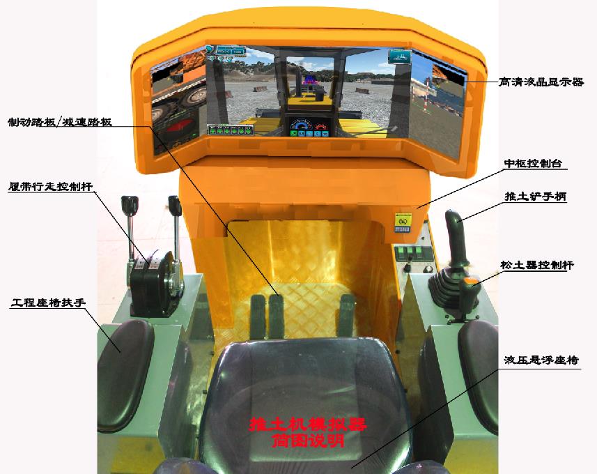 該模擬機教學設(shè)備硬件由設(shè)備底座、駕駛座艙、設(shè)備座椅、PC系統(tǒng)、視景顯示器、轉(zhuǎn)向控制桿、IC卡讀寫器、360度視角搖桿、制動踏板、減速踏板、松土器控制桿、數(shù)據(jù)采集系統(tǒng)及各種功能按鈕等組成。設(shè)備采用與真實推土機相同的操作部件,逼真的操作手感,使得其操作功能、操作感覺與真機完全吻合;