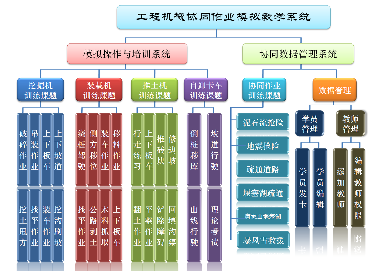 單機訓(xùn)練:行走練習、推磚塊、推土作業(yè)、回填溝渠、翻土作業(yè)、平整場地、鏟除障礙、修邊坡、空動作、自由作業(yè)操作。
