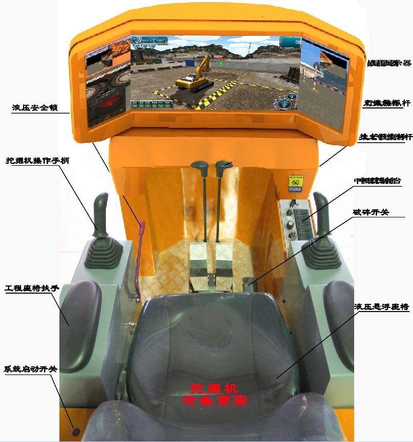 該模擬教學(xué)設(shè)備硬件由設(shè)備底座、駕駛座艙、液壓座椅、PC系統(tǒng)、視景顯示器、高靈敏度操作手柄、IC卡讀寫裝置、360度視角搖桿、行走操作桿,液壓安全鎖桿,數(shù)據(jù)采集系統(tǒng)及各種功能按鈕等組成;配件均采用與真實挖掘機(jī)相同的操作部件,逼真的操作手感,使得其操作功能、動作感覺與真機(jī)完全吻合。