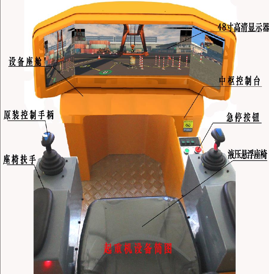 該設(shè)備硬件由懸浮式座椅、駕駛座艙、底座平臺、PC系統(tǒng),視屏顯示器,原裝門式起重機(jī)聯(lián)動臺,急停按鈕,IC卡讀寫裝置、360視角調(diào)整搖桿、數(shù)據(jù)采集卡、控制臺及各種功能控制按鈕組件等組成。設(shè)備采用與真實(shí)塔吊相同的操作部件,逼真的操作手感,使得其操作功能、操作感覺與真機(jī)完全吻合;