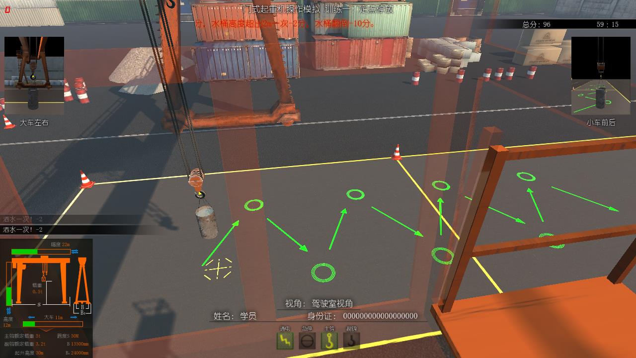門式起重機模擬器由懸浮式座椅、駕駛座艙、底座平臺、PC系統(tǒng),視屏顯示器,原裝門式起重機聯(lián)動臺,急停按鈕,360視角調(diào)整搖桿、數(shù)據(jù)采集卡、控制臺及各種功能控制按鈕組件等硬件,配以根據(jù)特種設(shè)備作業(yè)人員考核標(biāo)準(zhǔn)(DL/T 5250-2010)開發(fā)而成的軟件組成。系統(tǒng)具有訓(xùn)練課題、考核課題、理論考核等科目,對操作學(xué)員進行培訓(xùn)考核、鑒定。
