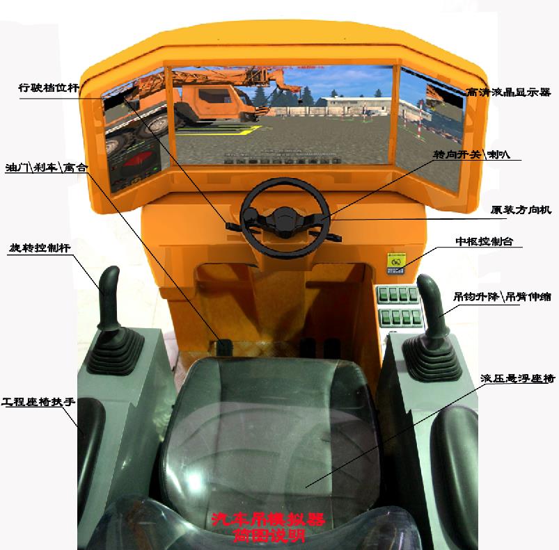 該模擬教學(xué)設(shè)備硬件由懸浮式座椅、駕駛座艙、底座平臺、PC系統(tǒng),視景顯示器,方向機(jī),檔位桿,操作手柄,IC卡讀寫裝置、360視角調(diào)整搖桿、油門、離合、剎車踏板,轉(zhuǎn)向開關(guān),數(shù)據(jù)采集卡、控制臺及各種功能控制按鈕組件等組成。設(shè)備采用與真實汽車起重機(jī)相同的操作部件,逼真的操作手感,使得其操作功能、操作感覺與真機(jī)完全吻合;